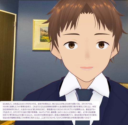 株式会社スタジオアイ(本社:広島県、代表取締役:[相川真太郎])は、新卒・中途採用向け説明会において、社長の思考・口癖はもちろん、「~じゃけぇ」「~しとる」といった広島弁までも徹底的に再現したこだわりの分身「AI シンタロウ社長」との対話企画を実施しました。