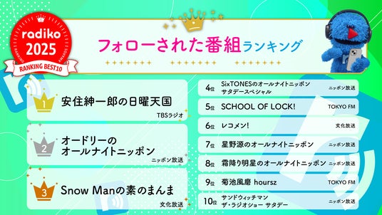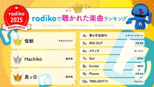 スマートフォンやパソコン等でラジオやポッドキャストが聴ける無料サービス「radiko(ラジコ)」を提供する株式会社radiko(代表取締役社長:池田 卓生、所在地:東京都港区)は、2025年radikoで聴かれたラジオ番組・音楽を振り返る年間ランキングを発表しました。
