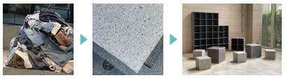 布だけではなく合成皮革など廃棄衣料品に含まれるさまざまな繊維をアップサイクルすることができる繊維リサイクルボード。硬度があり加工しやすく、店舗やオフィスなどの様々な空間の内装、ディスプレイ什器、家具など、多様な目的に使用することができ、使用後も再びボードとしてリサイクルすることができる。