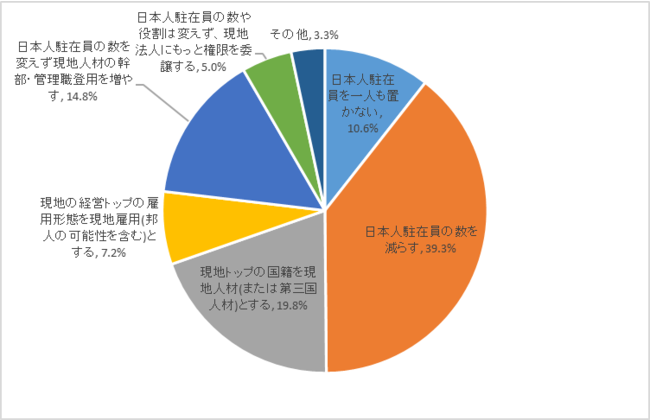(3)目指す現地化の状態は、「日本人駐在員の数を減らす」(39.3%)、「現地トップの国籍を現地人材とする」(19.8%)、「日本人駐在員の数を変えず現地人材の幹部・管理職登用を増やす」(14.8%)