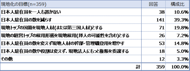 現地化を進める計画や意向がある359社に、現地化の目的をきいたところ、「ビジネスを現地化したい(現地市場の開拓など)」(51.3%)「駐在員の派遣に伴う各種コストを削減したい」(46.5%)「より優秀な現地人材を確保したい」(38.2%)となりました。