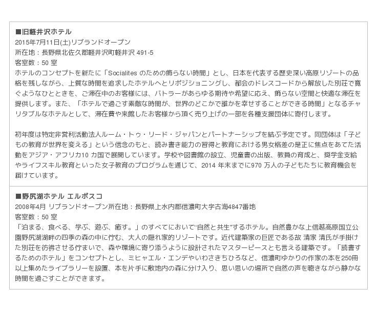 2015年7月11日にリブランドオープンする、アゴーラ・ホテルアライアンス「旧軽井沢ホテル」をはじめ、株式会社アゴーラ・ホスピタリティーズの起業、原点となった2008年4月にリブランドした「野尻湖ホテルエルボスコ」などにもちなんだフェアで、信州の魅力を紹介しています。