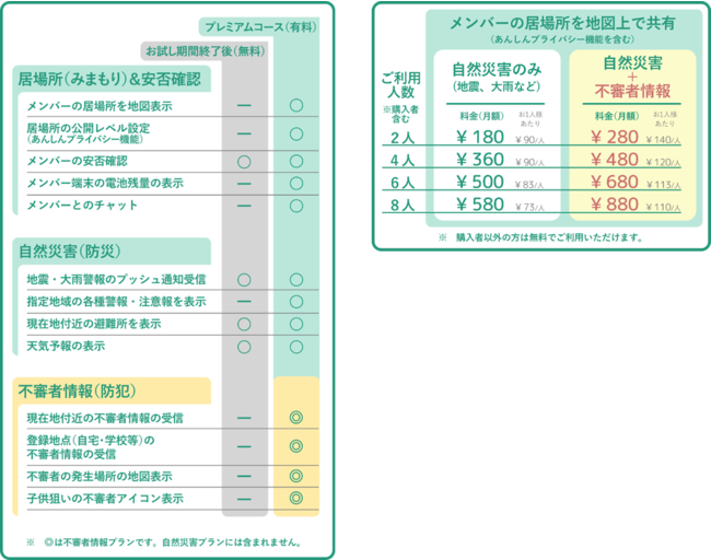一人ひとりが課金する「お一人様用」「プライバシー重視」の『ココダヨ』。 従来同様、緊急地震速報など災害警報に連動して、登録した最大8名にメールで位置情報が送信される。天気予報や避難所情報等、付帯機能もそのまま利用できる。 ストア価格:180円(5名プラン)/300円(8名プラン)