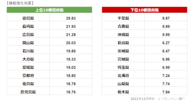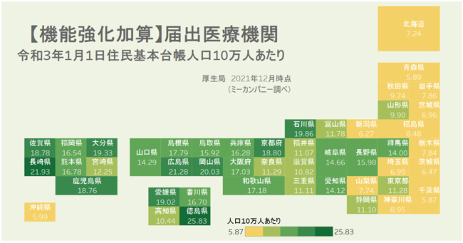 現在、かかりつけ医機能全般をあらわす機能強化加算を届け出ている医療機関は、人口10万人あたり12.43件(2021年12月時点)。都道府県別にみると、徳島県が最も多く25.83件、千葉県が5.87件と最も少ない結果となりました。かかりつけ医機能を担う医療機関の充実度は、地域によって大きく異なるようです。