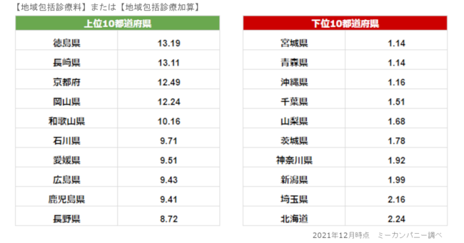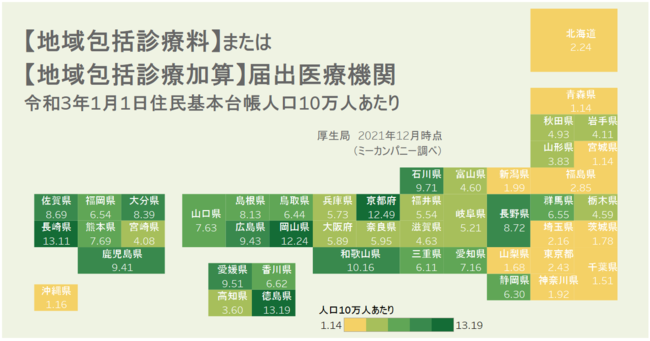 現在、外来におけるかかりつけ機能である地域包括診療料あるいは地域包括診療加算を届け出ている医療機関は、人口10万人あたり4.97件。都道府県別では、徳島県の13.19件が最も多く、青森県・宮城県では1.14件でした(2021年12月時点)。