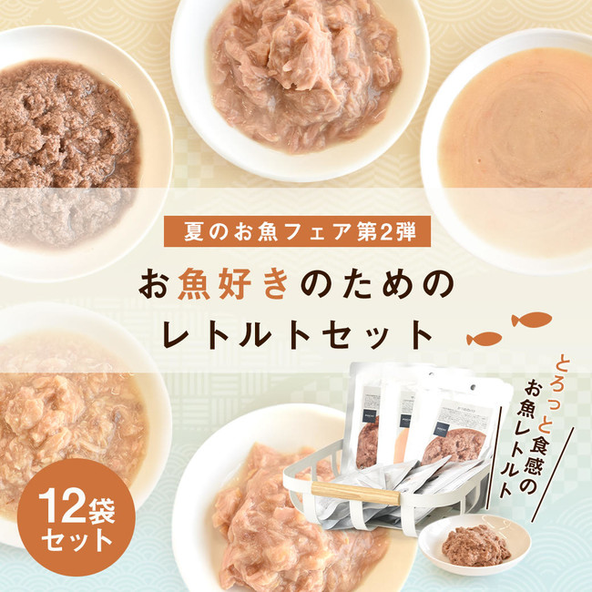 季節に合わせた今回のセット品「お魚好きのためのレトルトセット」は、夏にうれしいタウリンやとくにシニア犬などは冷房による血行不良の対策にDHA・EPAといった栄養と、「とろみ」が付いたレトルトからセレクトしています。