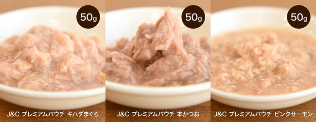 なめらかな仕上がりが特徴のPOCHIレトルト3種類と、J&Cから新登場の『グレイン・グルテンフリー、高タンパク・低脂質・低カロリー』がポイントのプレミアムパウチ3種類を特別セットにしました。POCHIとJ&Cそれぞれマグロ・カツオ・サーモンの3種のお魚からセレクトしたレトルト6種類が各2袋ずつで、合計12袋入りです。