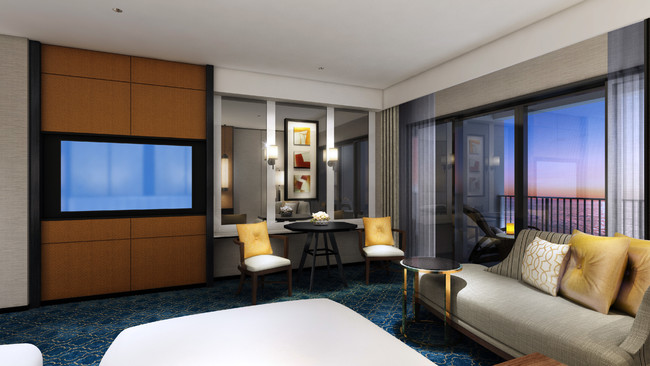 客室は全443室がオーシャンビュー。バルコニーからは碧く輝く東シナ海と水平線に沈むサンセットなどを見渡し、刻々と変わる美しい景色をご堪能いただけます。デザインコンセプト「琉球コロニアル」を表現したインテリアは、宮古上布をモチーフにしたベッドボードなど、沖縄の伝統工芸からインスパイアされた装飾が彩ります。