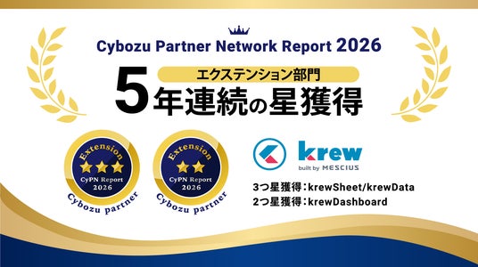 メシウス株式会社(本社:宮城県仙台市泉区、代表取締役社長:小野 耕宏)が提供する、サイボウズ株式会社の業務改善プラットフォーム「kintone」向けプラグイン「krew」シリーズは、サイボウズ株式会社が実施するオフィシャルパートナー評価制度 「CyPN Report 2026」エクステンション部門において、下記の通り星評価を獲得しました。