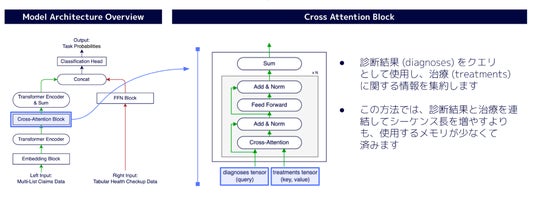 全国規模の保険者のレセプトデータ (2014 年 4 月 ~ 2022 年 3 月診療分) を利用し、主要心血管疾患(MACE)の予測モデルの性能を向上させることを目的としました。心筋梗塞や脳血管疾患、心不全、末梢動脈疾患などの複合疾患であるMACEは世界的に主要な死因であり、予防は喫緊の課題です。私たちは、診断と治療の関係を効果的に重み付けして予測に活用するために、Cross Attention メカニズムを応用しました。具体的には、レセプトデータに含まれる診断と治療の月次データを Transformer Encoder を用いて変換し、その後 Cross Attention を用いて診断と治療の相互関係を反映した特徴ベクトルを作成しました。これと健康診断の検査値データを統合し、MACEを予測する新たな予測モデル*3を構築しました。
