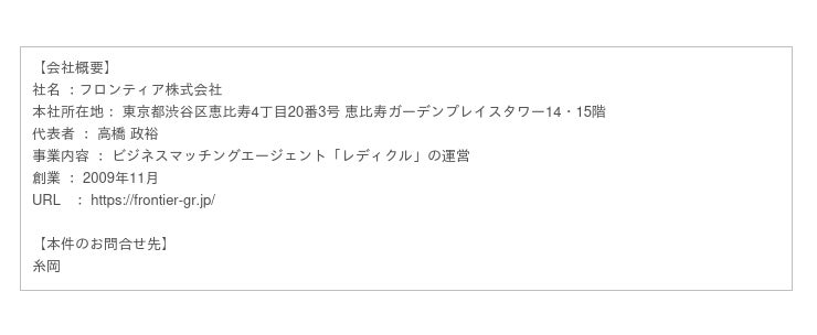 ビジネスマッチングエージェント「Ready Crew(レディクル)」を運営する、フロンティア株式会社(本社:東京都渋谷区、代表取締役:高橋 政裕、以下 当社)は、「第6回 営業支援EXPO【春】」に出展いたします。