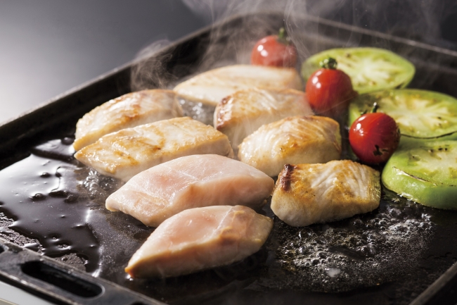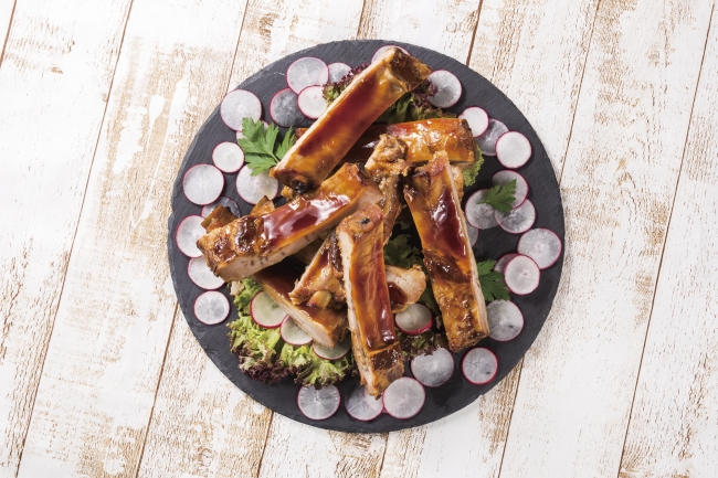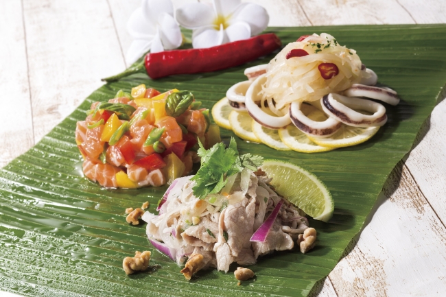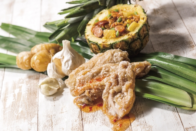 サーモンやパプリカなど見た目にも華やかなハワイの伝統料理「ロミロミサーモン」、オレンジとバルサミコ酢入りの特製ソースに漬けこんだジューシーな「やわらかポークスペアリブ」、パイナップルの甘さと香りたつスパイスが食欲をそそる「グランサンク風パイナップルライス」、衣に米粉を使用したハワイの唐揚げ「モチコチキン」に加え、ハワイ名物「マヒマヒの鉄板焼き(平日ランチのみ)」は青トマトを使用したさわやかなケッカソースとともにご賞味いただけます。