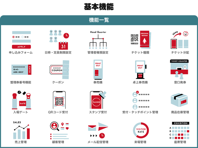 チケットの販売(オンライン販売、現地販売)、発券から来場者管理、データ集計や情報の資産化・活用まであらゆるプロセスを見える化し、さらに施設ごとに求められる多種多様なニーズに対しても柔軟なカスタマイズにて対応し、独自のオリジナルチケット販売システムをご提供します。