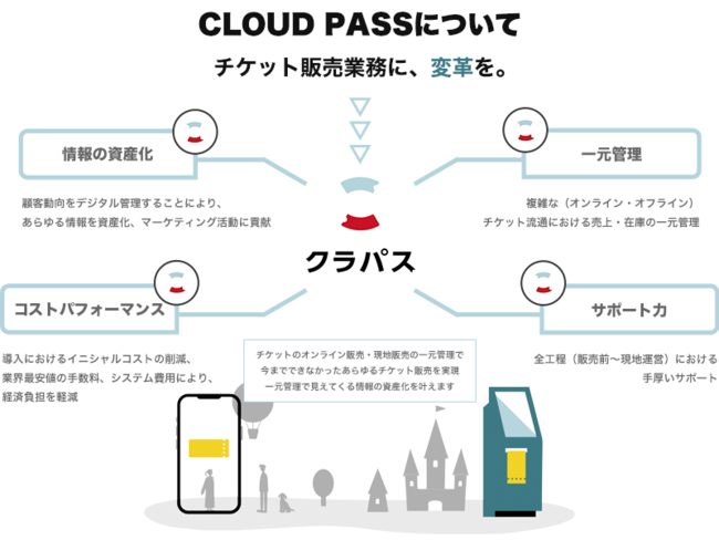 「CLOUD PASS」は、レジャー・アミューズメント施設でのスムーズなチケット流通を実現するチケット販売管理システムです。
