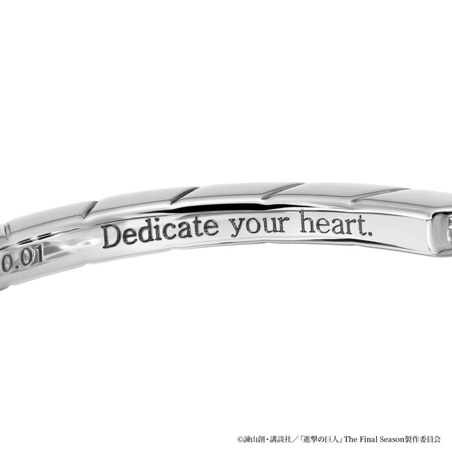 リングの内側には“Dedicate your heart.(心臓を捧げよ)”のメッセージがさりげなく刻印されており、リヴァイ兵士長や物語の世界観をいつも近くに感じて頂けます。高品位なプラチナ950を使用し、末長くご愛用していただけるジュエリーに仕上げました。