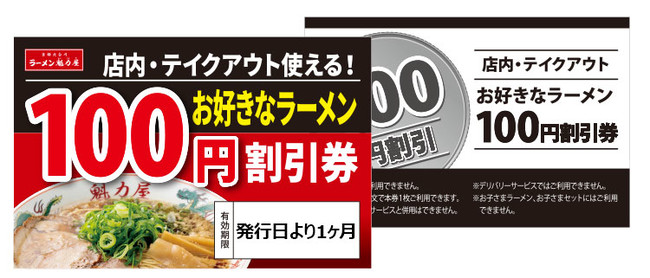 ラーメン魁力屋では来店時に店内飲食、テイクアウトで利用できる100円割引券を配布しています!
