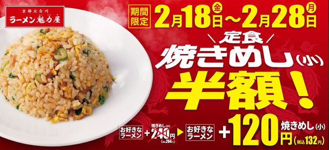 京都北白川ラーメン魁力屋をチェーン展開する株式会社魁力屋、(http://www.kairikiya.co.jp本社:京都市中京区、代表取締役社長:藤田 宗、以下魁力屋)は、2022年2月18日(金)より、期間限定「定食焼きめし半額フェア」を実施いたします。