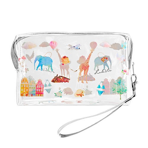 石丸海さんデザインのオリジナルクリアポーチには、夏の旅行での新たな出会いを彷彿とさせる飛行機や気球、動物のイラストがあしらわれています。旅行バッグにコンパクトに収まる嬉しいサイズ。