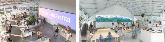 (左)うめきた公園内「大屋根施設」(提供:グラングリーン大阪開発事業者) (右)PLAT UMEKITA 3つのゾーン