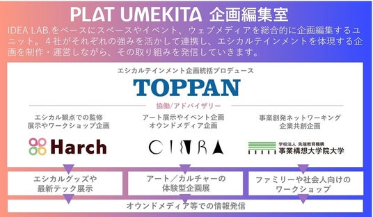 TOPPANを中心にCINRA、ハーチ、事業構想大学院大学の4者で「PLAT UMEKITA企画編集室」を組成。IDEA LAB.をベースにこのスペースのコンセプトを体現する展示/イベントを様々なクリエイターと共創します。また、定期的なワークショップも開催し、都市公園の新しい楽しみ方をつくりだすコミュニティの創出を目指します。最新のエシカル情報を発信し、リアルスペースでの企画に連動した各種メディアも制作する予定です。