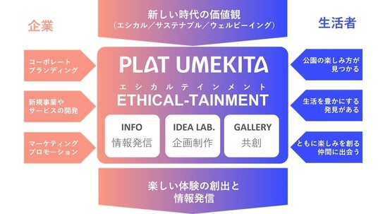 本施設ではTOPPAN、CINRA、ハーチ、事業構想大学院大学の4者で「PLAT UMEKITA企画編集室」を立ち上げ、“エシカルテインメント”※をテーマに様々な体験型プログラムで都市公園の魅力を国内外に発信していきます。また、本施設を開発事業者、地域住民、クリエイター、企業、学術団体、自治体等と連携・共創し、新しいプロダクト・サービス・事業の創発を行う拠点と位置づけ、社会的価値創造企業として持続的なまちづくりに貢献していきます。