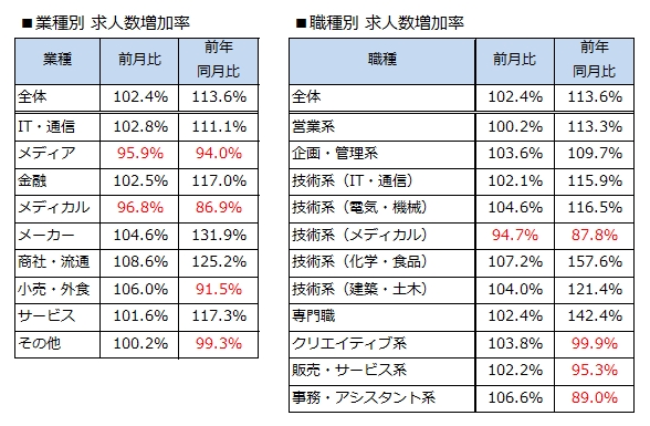 業種別にみると、求人数が増加したのは9業種のうち「IT・通信」「金融」「メーカー」「商社・流通」「小売・外食」「サービス」の6業種となりました。特に伸びたのは、「商社・流通」(前月比108.6%)、「小売・外食」(前月比106.0%)でした。職種別で求人数が増加したのは、11職種のうち「営業系」「企画・管理系」「技術系(IT・通信)」「技術系(電気・機械)」「技術系(化学・食品)」「技術系(建築・土木)」「専門職」「クリエイティブ系」「販売・サービス系」「事務・アシスタント系」の10職種となりました。特に伸びたのは、「技術系(化学・食品)」(前月比107.2%)、「事務・アシスタント系」(前月比106.6%)でした。