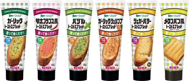 既に同容器を使用している「メロンパン風トーストスプレッド」(2022年8月発売)に加え、5品(ガーリック、明太フランス風、バジル、ガーリックシュリンプ、シュガーバター)が2月末から順次新容器に変わります。