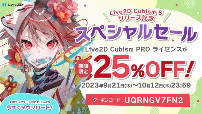 2023年9月21日(木)~2023年10月12日(木)の22日間限定で『Live2D Cubism PRO ライセンス』が25%OFFでご購入頂けるクーポンを配布します!