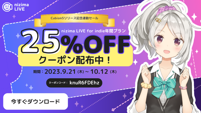 「nizima LIVE Indie 年間プラン」も25%OFFでご購入頂けるクーポンを配布します。Live2D Cubism PROとnizima LIVEをセットでお得にはじめるチャンス!