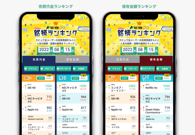 ※「売買代金」「保有金額」は、カビュウ独自の相対指標『スコア』に置き換えられ、実際の金額は表示されません。