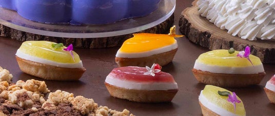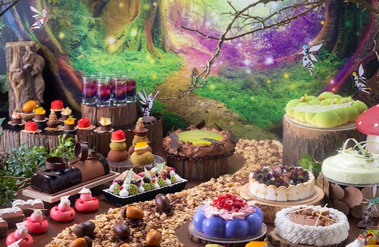 スイーツの甘い香りに誘われて妖精や小人、動物たちが集まってくる神秘的な森を表現した今回のスイーツビュッフェ。エグゼクティブ・ペストリーシェフの百田 利治(ひゃくだ としはる)がお届けする旬の食材をふんだんに使用したスイーツセレクションと、学生たちがデザインした店内装飾やオブジェが唯一無二の世界観を造り出します。