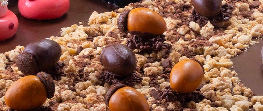 コロンとかわいい見た目の「小路のどんぐり」は、カリカリとしたライスパフの食感とプラリネムース、クランベリーと黒蜜のゼリーが見事にマッチしています。