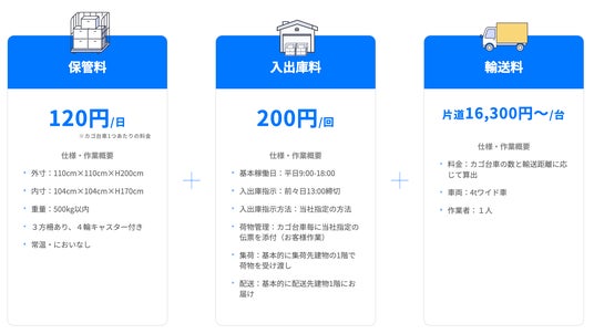 なお、【カゴ台車・荷物詰め放題プラン】はsouco社が提携する輸送業者がカゴ台車の手配・荷物の集荷配送を行い、全国のsouco社の登録倉庫にて荷物保管を行います。[1]