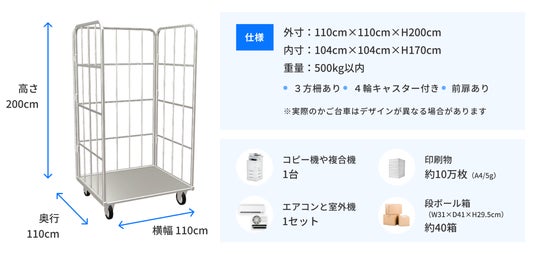 これまでsouco社では、顧客が保有しているカゴ台車に収納された荷物を対象にカゴ台車保管プランの提供を行っていましたが、今回新たにカゴ台車のレンタル~保管~集荷・配送までを一括で提供する【カゴ台車・荷物詰め放題プラン】の提供を開始しました。これにより、自社でカゴ台車を保有していない荷主企業に対してもカゴ台車単位の荷物保管サービスの提供が可能となりました。本サービスは、段ボール荷物や家具什器、家電機械類など荷姿の異なる複数の荷物を専用のカゴ台車に「詰め放題」で保管できる点も特徴です。