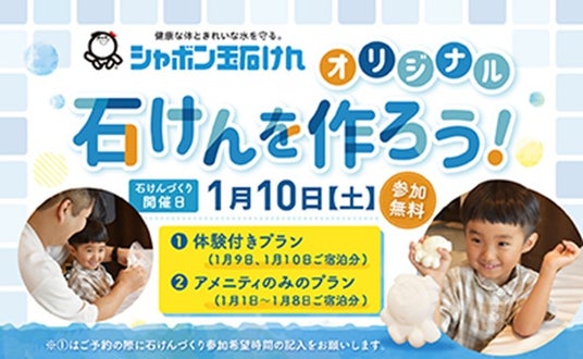 JR九州ホテルズアンドリゾーツ株式会社が運営するJR九州ステーションホテル小倉(福岡県北九州市小倉北区、総支配人 白濱正信)では、ご家族でご宿泊されるお客さまを対象に、2026年1月9日(金)・10日(土)の宿泊者限定で「オリジナル石けん作り体験付宿泊プラン」を販売いたします。本プランでは、地元企業である「シャボン玉石けん株式会社」(福岡県北九州市若松区南二島2丁目23番-1号 代表取締役社長 森田隼人)とタイアップし、オリジナル石けん作り体験に加え、無添加シャンプーなどのアメニティ5種をご用意。ご好評をいただいた前回に続く第2弾として実施する本企画では、新たにフォトスポットの設置や開催スペースの拡大、客室装飾の充実を図りました。日頃、商品企画を専門としないホテルスタッフが、ご家族連れのお客さまに安心してお楽しみいただける体験を提供したいという想いのもと、無添加にこだわって企画・開発した宿泊プランです。