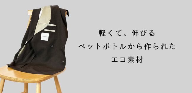 おすすめの素材は、国内で回収されたペットボトルを原料とするリサイクルポリエステル100%の生地です。 原糸は細いものを使用している為、化学繊維特有のドライなタッチが軽減されています。また伸縮性が高く、素材としての強度も高いためシワにもなりづらく、ノンストレスで着用できます。 店頭にサンプルもご用意しておりますので是非体感してみてください。