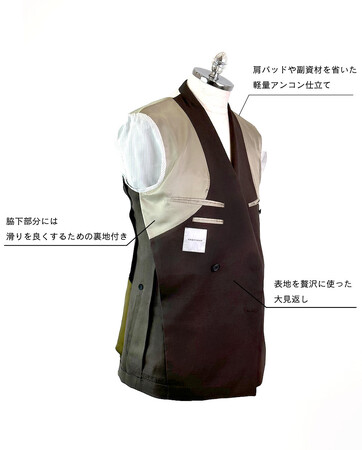 クラシックスーツと同じパターンを採用することで細かい体型補正を可能にしながら、肩パッドや副資材を省いた軽量な仕立てが柔らかい着用感を実現しました。 ”セットアップではカジュアルすぎる”といったシーンでも快適に着用できる、「フォーマル過ぎずラフ過ぎない程よいスタイル」の盛夏に向けたエコ素材のスーツです。