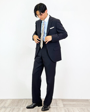 【定番のネイビーセットアップはタイドアップできちんとした印象に】