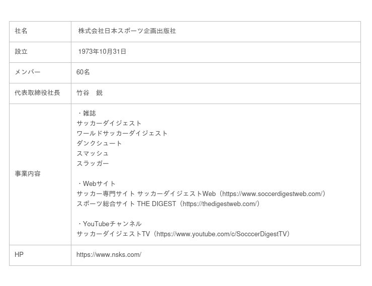1973年創業の出版社。サッカーダイジェスト、ワールドサッカーダイジェスト、ダンクシュート、スマッシュ、スラッガーなどの各種雑誌の制作・発行をはじめ、WebサイトやYouTubeチャンネルも運営する。
