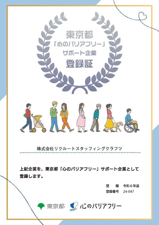 株式会社リクルートスタッフィング(本社:東京都千代田区、代表取締役社長:田中 智己、以下「リクルートスタッフィング」)の特例子会社である株式会社リクルートスタッフィングクラフツ(以下、「リクルートスタッフィングクラフツ」)が、令和6年度 東京都「心のバリアフリー」サポート企業に登録されたことをお知らせします。