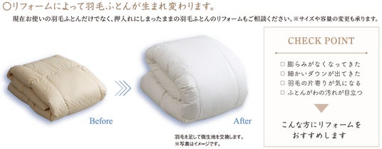 「羽毛ふとんの膨らみがなくなってきたな」「細かいダウンが出てくる」「羽毛の片寄りが気になる」「ふとんがわの汚れが目立ってきた」「押入れに使用していない羽毛ふとんがある」