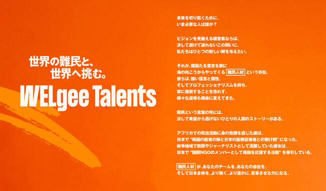 NPO法人WELgeeは、”難民特化”の伴走型人材紹介サービス「JobCopass」を「WELgee Talents(ウェルジータレンツ) - 世界の難民と、世界へ挑む。- 」に改め、サービスページを全面リニューアルしたことをお知らせします(URL:https://welgee-talents.jp/)。「世界の難民と、世界へ挑む。」というサービスのタグライン・ステートメントを新たに策定した他、難民人材を採用し、活躍に導いた4社の事例記事を紹介しています。