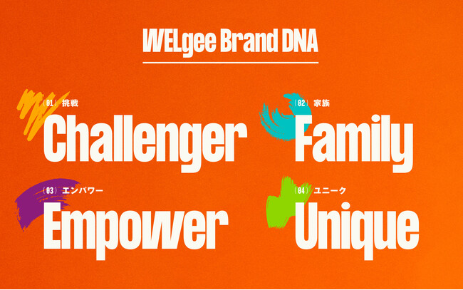 今回のリブランディングでは、「WELgeeが持つ独自の価値」をWELgee Brand DNAとして抽出しました。DNAはChallenger(挑戦)、Family(家族)、Empower(エンパワーメント)、Unique(ユニーク)の4つで構成され、WELgee TalentsはChallenger要素を全面的に押し出したデザインや写真にこだわりました。