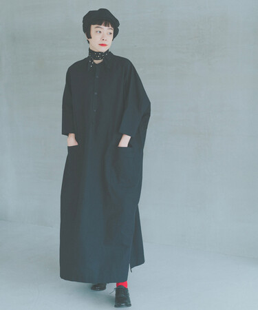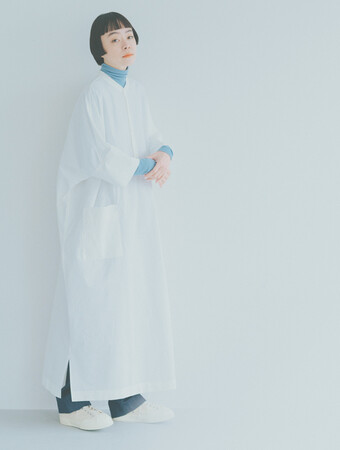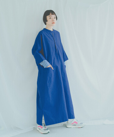 「オーバーサイズだけどすっきり着られる、 今欲しいワンピースを作りました。サイドスリットは肌見えしすぎない、靴下やボトムが少し見えるバランスに仕上げたので、足元のおしゃれも一緒に楽しんでもらいたいです。」