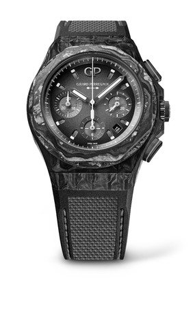 新しいクロノグラフは直径 44 mm で、カーボングラス製のケースに収められています。カーボングラスは頑丈で非常に軽い素材で、ロレアート アブソルート クリスタルロックも重量わずか 94 g しかありません。カーボンファイバーとグラスファイバーの層を組み合わせたハイテク素材で、高温、高圧を加えることで均質化されます。その後は、様々な形状に加工することができます。こうして生まれるケースは、若干ざらつきのある、マットな質感に仕上がります。興味深いことに、製造時、内部の層に不規則性が生じてランダムな配列となることから、ケースはすべて異なる外観を呈し、どの時計も世界に一つだけのものとなります。