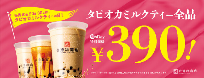 2022年9月20日(火)より、毎月10日・20日・30日の「タピオカミルクティーの日」にご来店、台湾甜商店のポイントカードを提示もしくは作成いただくと、当店自慢のタピオカミルクティー全品を390円にて提供いたします。