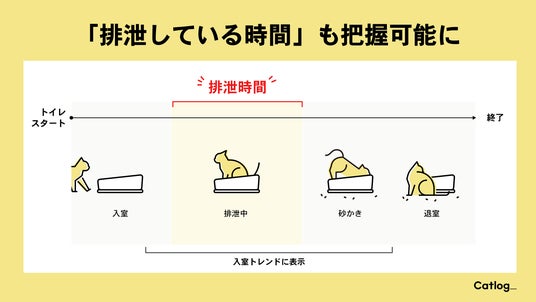 今回、Catlog Boardをご利用されている場合には、トイレ利用トレンドに従来の「入室トレンド」に加えて「排泄時間トレンド」を追加、排泄時間の変化を確認が可能になりました。これらの機能により、普段、猫様がトイレに行く頻度と猫様の排泄にかかる時間をそれぞれ把握できます。また、排泄時間に大幅な増加が見られた場合にはアラートも表示されるため、尿道閉塞や便秘などの兆候となる「トイレには行っているのに、おしっこ・うんちを出そうとしているのに、出ていない」ことが早期に検知できるようになりました。