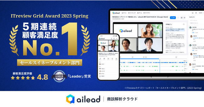 株式会社バベル(本社:東京都渋谷区、代表取締役:杉山大幹、以下バベル)が提供する商談解析クラウド ailead (エーアイリード)は、「 ITreviewカテゴリーレポート 2023 Spring 」のセールスイネーブルメント部門において最も高い満足度を獲得し、5期連続で顧客満足度No.1に選ばれたことをお知らせします。また、「 ITreview Grid Award 2023 Spring 」においても、顧客満足度と認知度の双方が優れた製品を表彰する「Leader」を受賞しました。