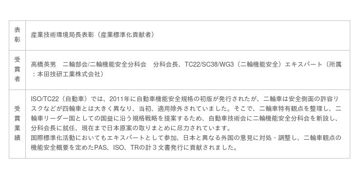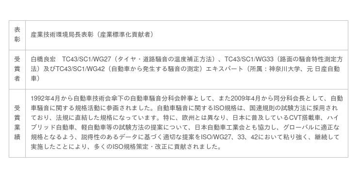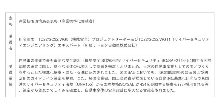 産業標準化事業表彰は、国際標準化機構(ISO)や国際電気標準会議(IEC)における国際標準策定、国内規格(JIS)策定や適合性評価活動といった産業標準化推進活動に優れた功績を残された方を経済産業省が表彰する制度です。