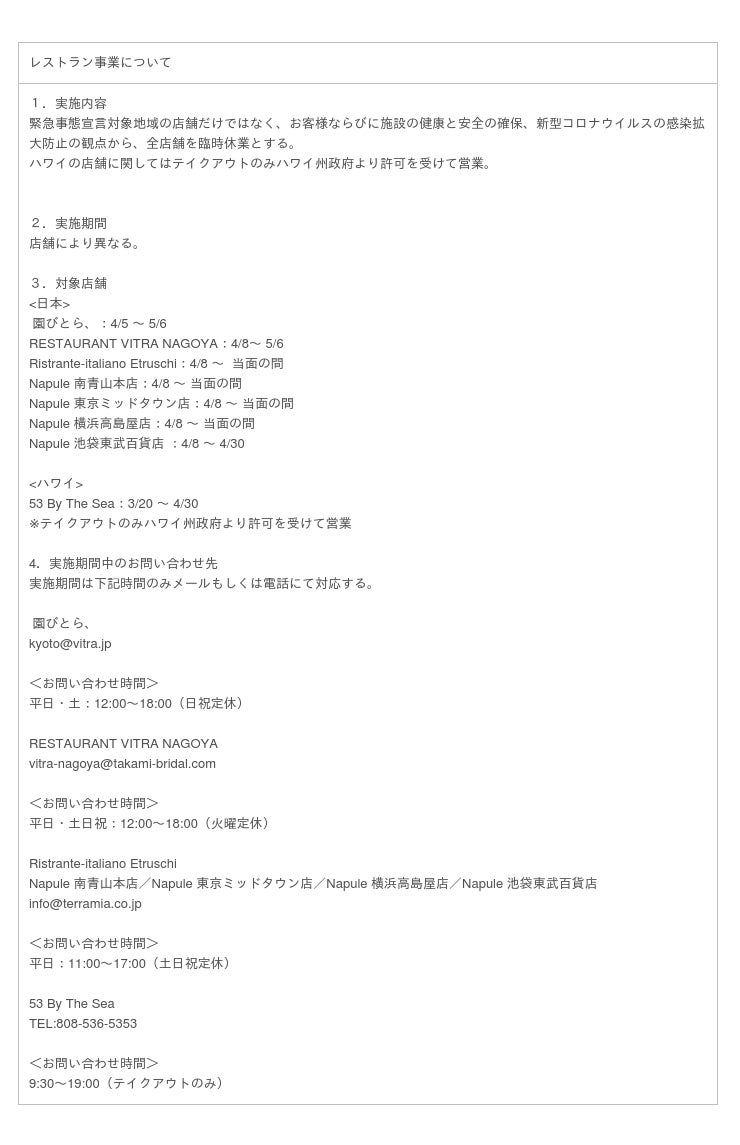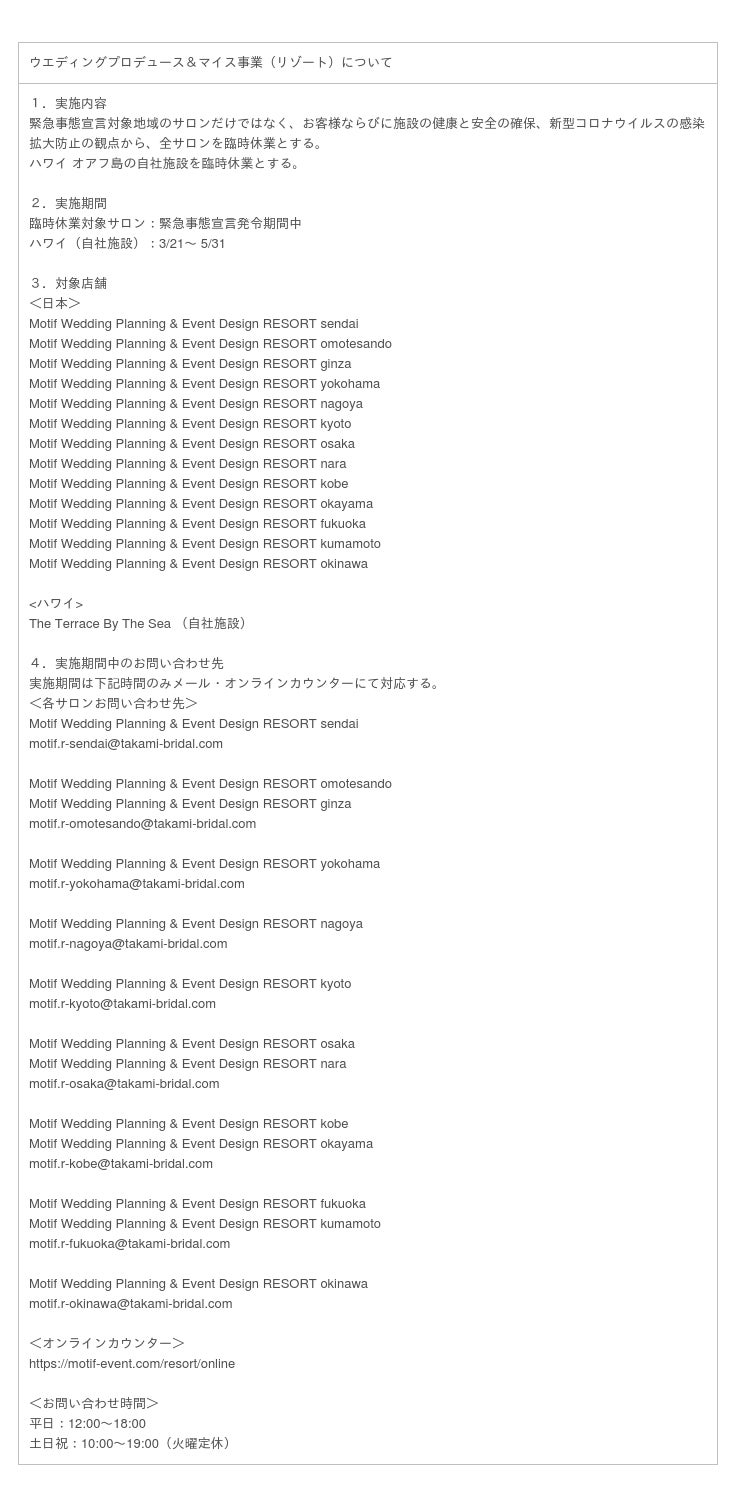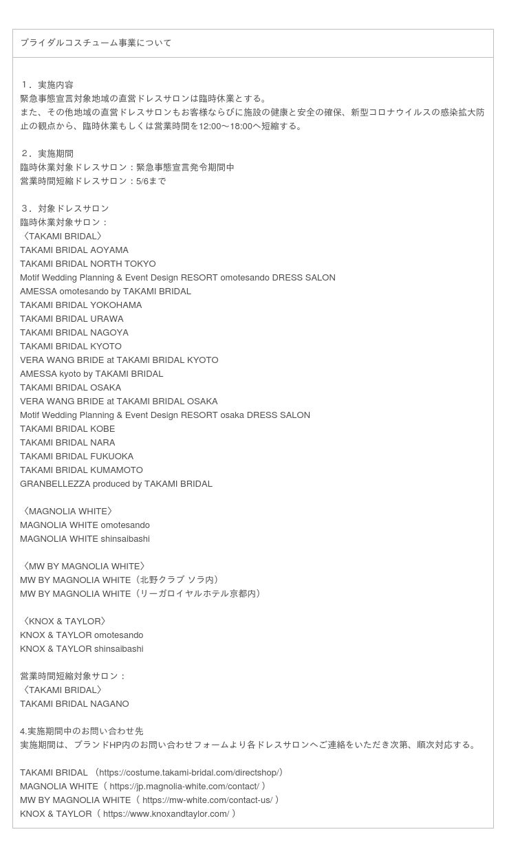 TAKAMI GROUPはお客様とクルー(従業員)の安全、そして新型コロナウイルス感染拡大防止への社会的責任を第一に考え、緊急事態宣言の対象エリア以外においても下記対応をとらせていただくことにいたしました。